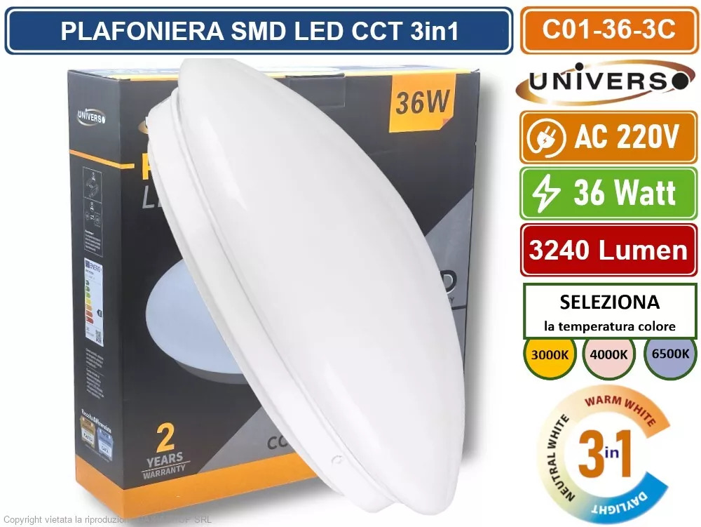 Universo C36W-3C è una plafoniera LED da parete o da soffitto con potenza di 36W e tecnologia LED SMD. La sua classica forma circolare è realizzata in metallo di colore bianco e la sua copertura in plastica è a finitura opaca. Con fascio luminoso di 180° e flusso luminoso di 3240 lm, questa plafoniera ad alta luminosità ha un rapporto di 90 lm/W.